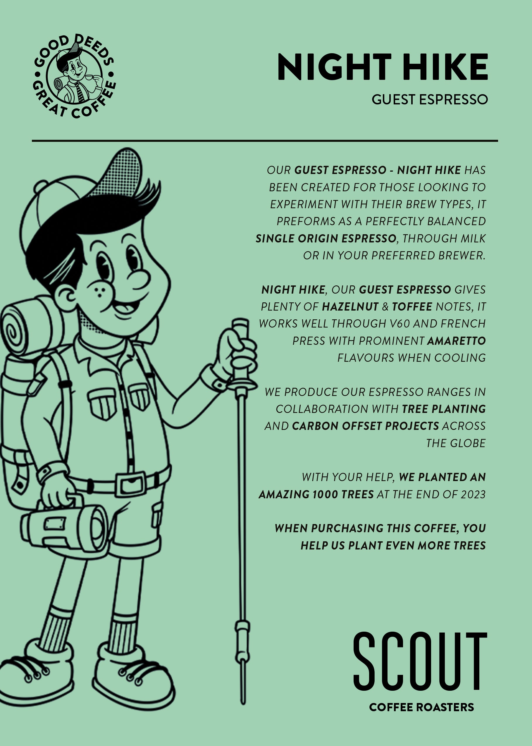 Night Hike is our New Guest Espresso from Colombia giving flavour notes of COCOA, WALNUT & TOFFEE APPLE