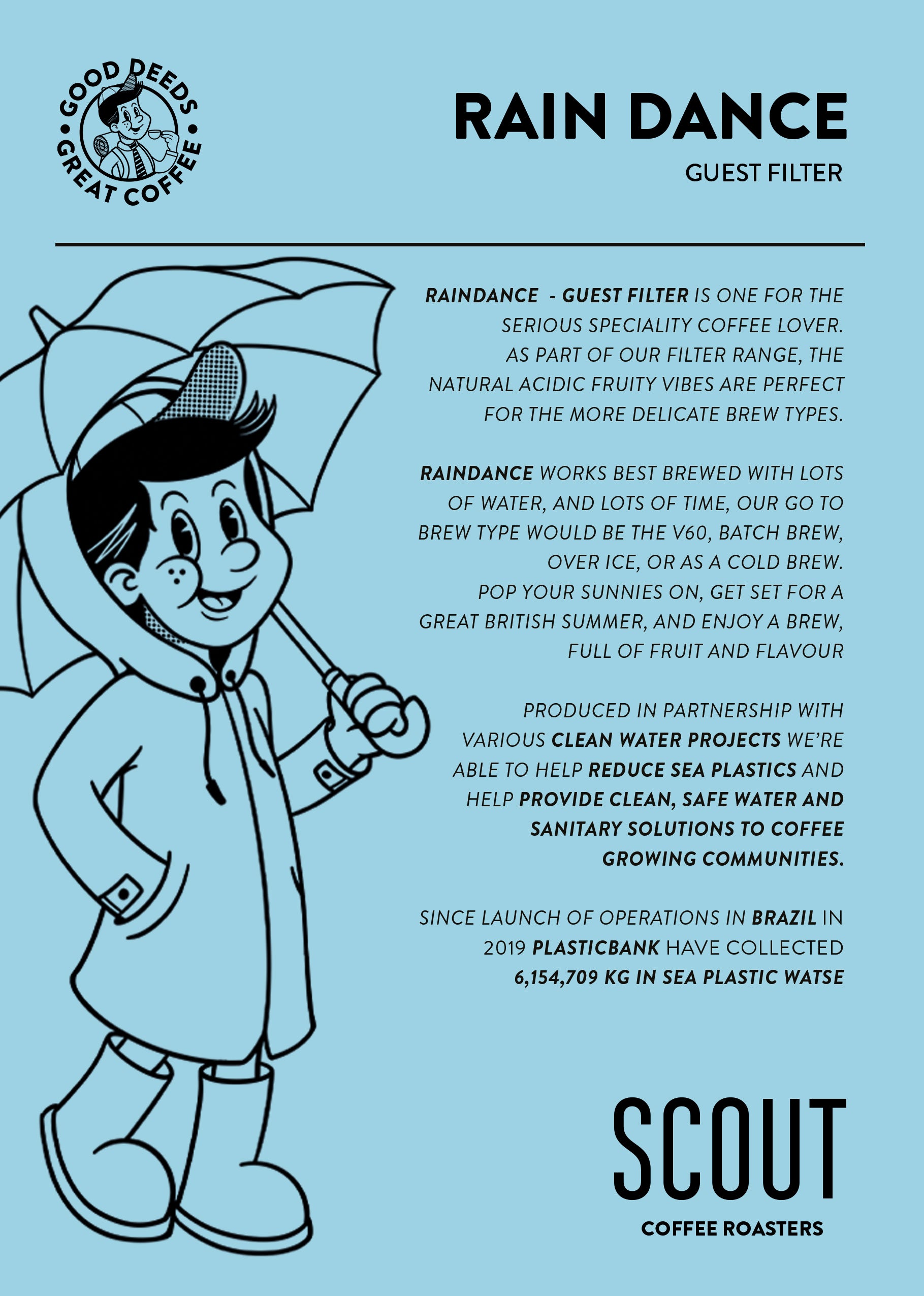 Here at Scout Coffee, we aim to support different charities with our different types of Coffee grinds. Rain Dance is produced in collaboration with Switch 2 Zero and their clean water projects, helping removal of Sea Plastics
